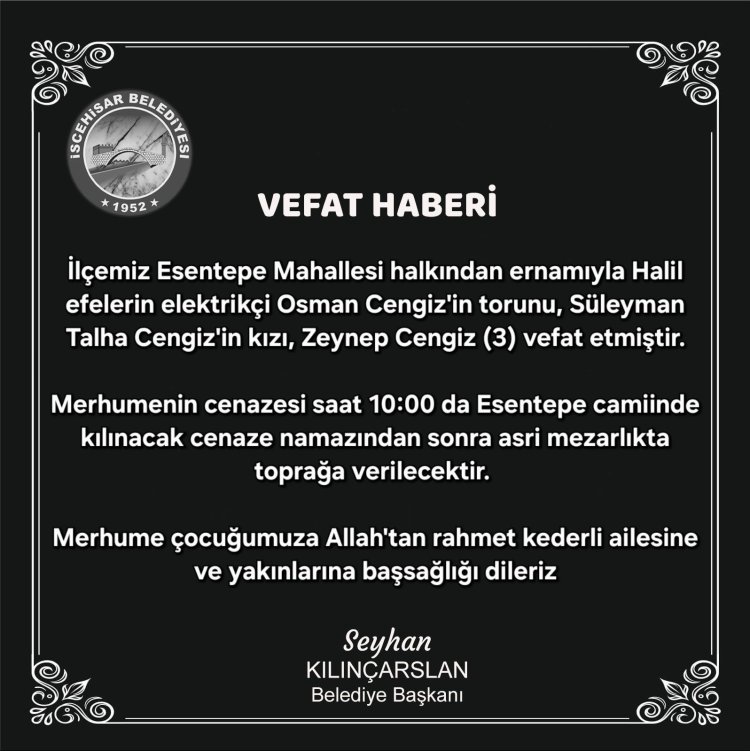 Merhumenin cenazesi saat 10:00 da Esentepe camiinde kılınacak cenaze namazından sonra asri mezarlıkta toprağa verilecektir.