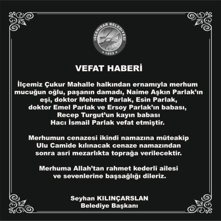 İlçemiz Çukur Mahalle halkından ernamıyla merhum mucuğun oğlu, paşanın damadı, Naime Aşkın Parlak’ın eşi, doktor Mehmet Parlak, Esin Parlak, doktor Emel Parlak ve Ersoy Parlak’ın babası, Recep Turgut'un kayın babası, Hacı İsmail Parlak vefat etmiştir.